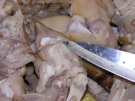 돼지 앞발을 사 올 때 반으로 갈라 가지고 옵니다.
